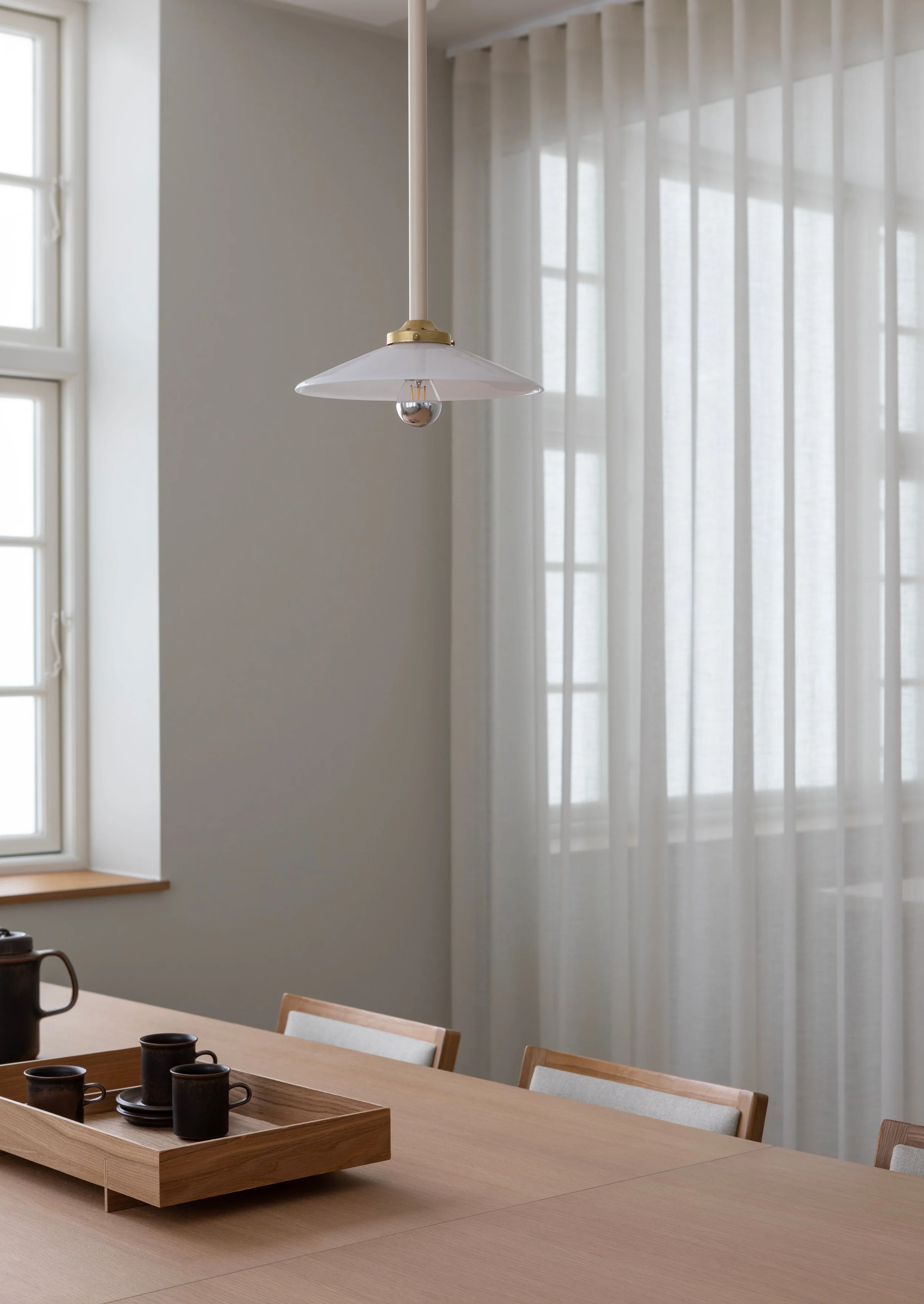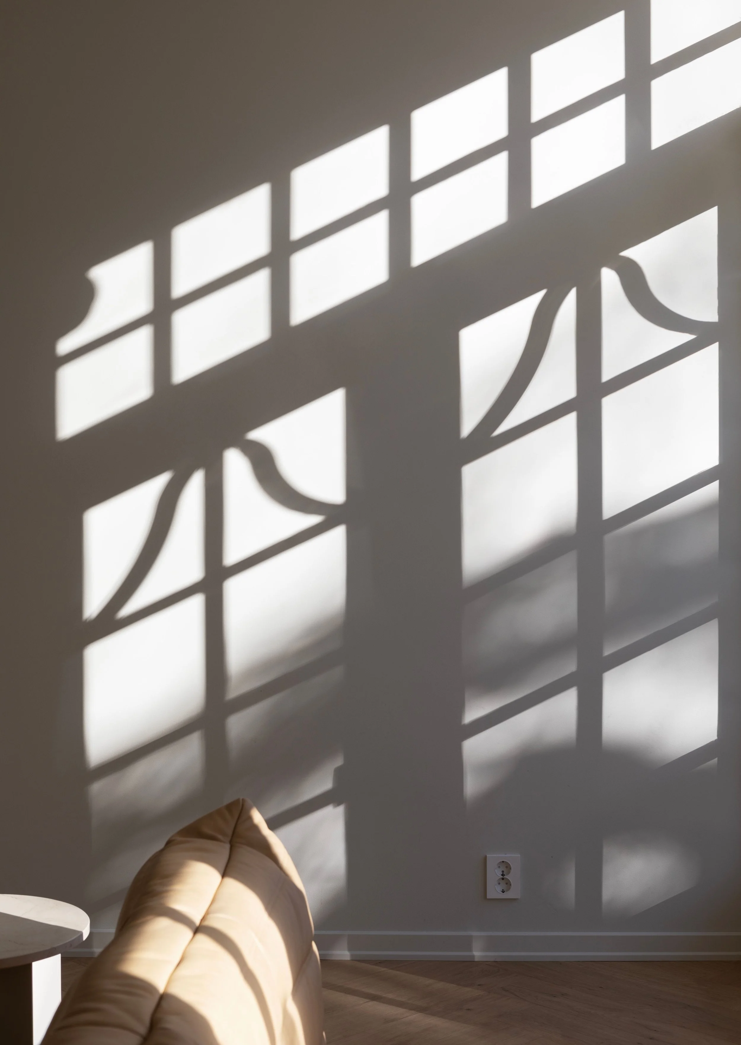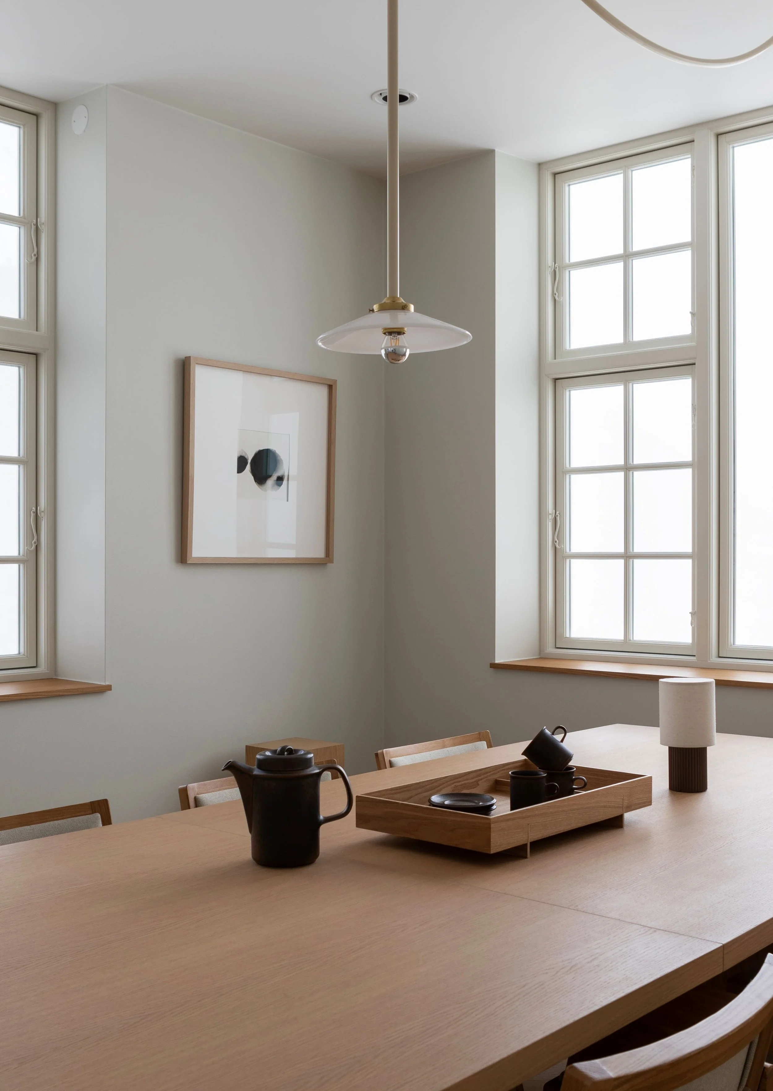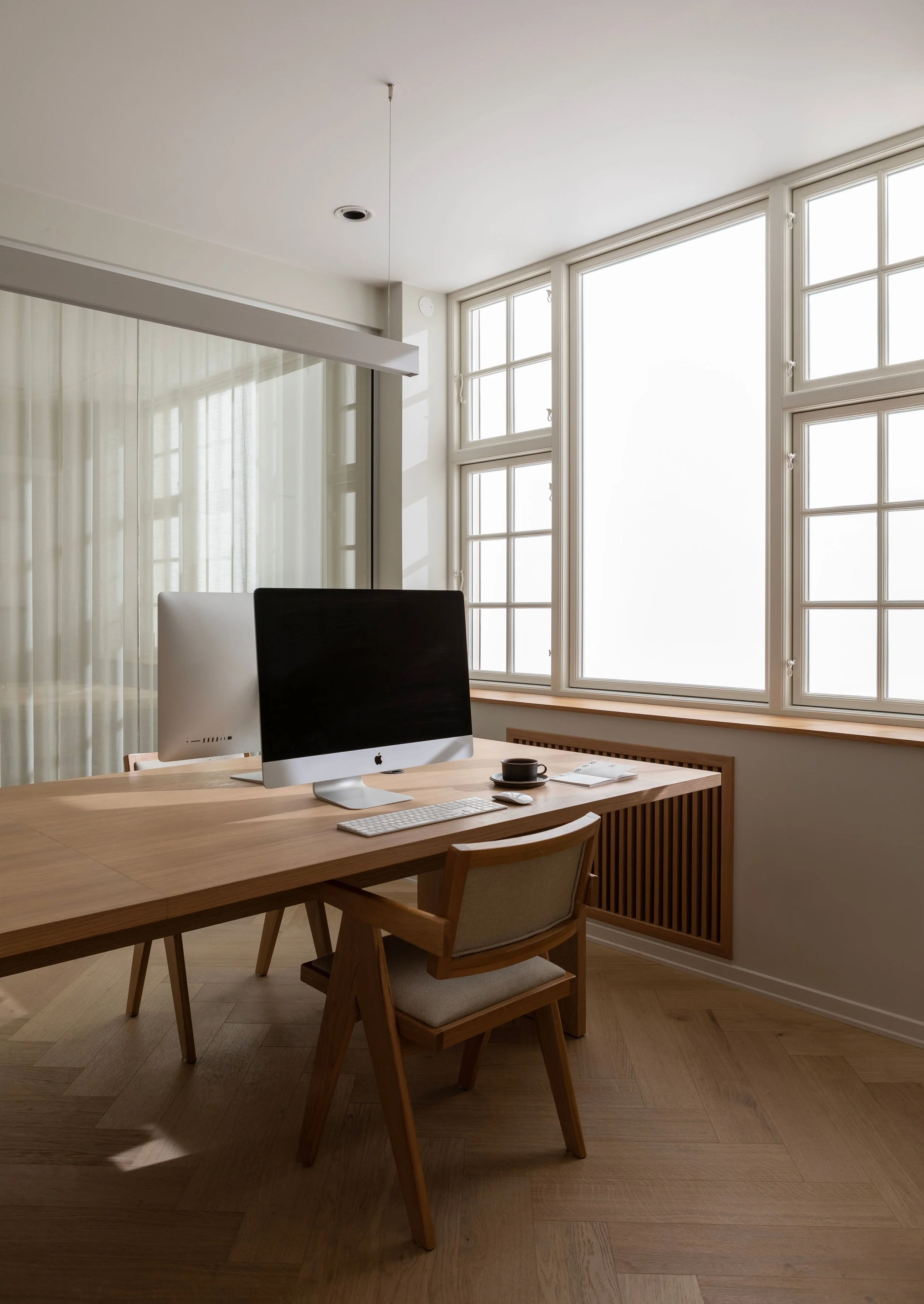 - Stikkord er et klassisk uttrykk, sammen med det lyse og minimalistiske. Det ble lagt ny tregulv i fiskebensutførelse som undertegner den klassiske følelsen. Nye, doble dører ble kopiert fra tidligere dører vi fant i bygget, og satt inn for å skape forbindelse mellom de tre rommene på rad, som også bidrar til at lyset får strømme fritt. Vinduene ble restaurert. Det ble også satt inn en ny kakkelovn i midtrommet som fungerer som samlingssted innredet med sofa og norske vintagestoler (Ekstrem Varier/ Terje Ekstrøm, Fureka/ Edvin Helseth). Alle møtebord/ arbeidsbord pluss kjøkken x2 er tegnet og plassbygget i tre av Håndtverkeriet. Bordene er tegnet i system så de kan settes sammen for fleksibelt bruk ved behov, hvis man f.eks skulle trenge et langbord. Møterommene er enkelt bygget opp av glassvegger med transparente gardiner som kan trekkes for etter behov. Vi ønsket å skape en hyggelig og imøtekommende atmosfære, og det var viktig at de ulike design grepene som ble gjort skulle gi fleksibilitet, flyt og harmoni når man beveger seg mellom de ulike sonene.
